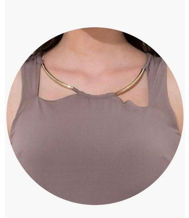 This is a sleeveless, floor-length bodycon gown in a muted taupe/mauve shade.